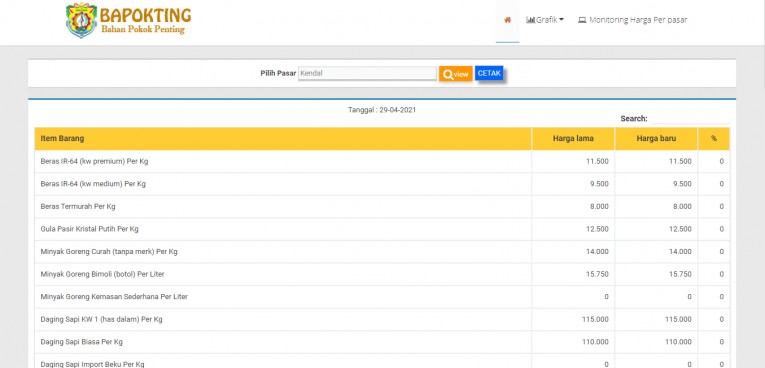 Data/informasi harga, khususnya komoditas bahan pangan pokok dapat diakses dengan mudah oleh masyarakat di alamat http://bapokting.kendalkab.go.id/