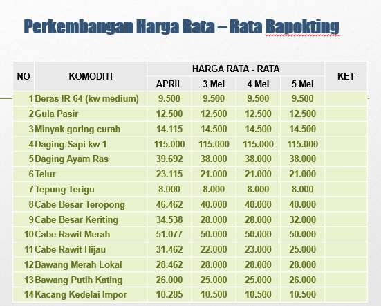Data/informasi harga, khususnya komoditas bahan pangan pokok dapat diakses dengan mudah oleh masyarakat di alamat bapokting.kendalkab.go.id