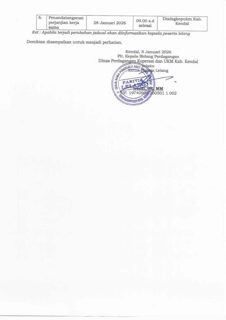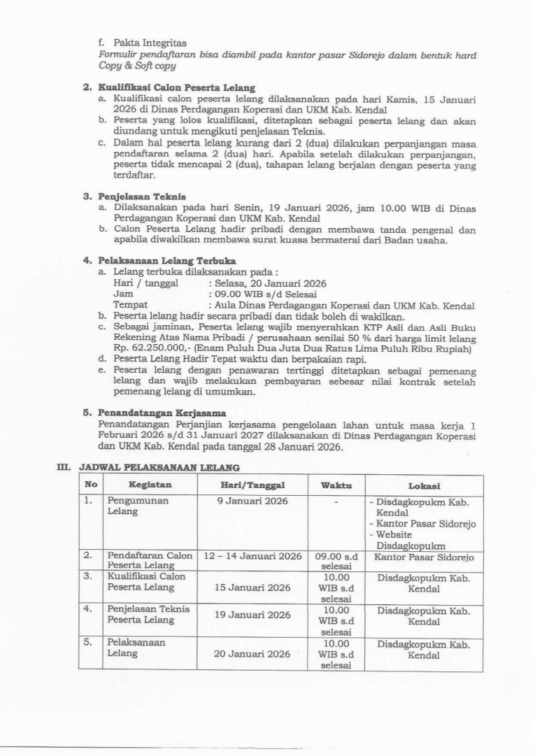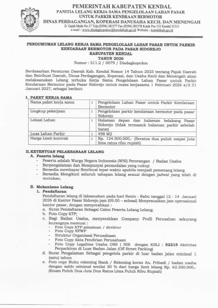Pengumuman Lelang Kerja Sama Pengelolaan Lahan Pasar untuk Parkir Kendaraan Bermotor pada Pasar Sidorejo Kabupaten Kendal Tahun 2026