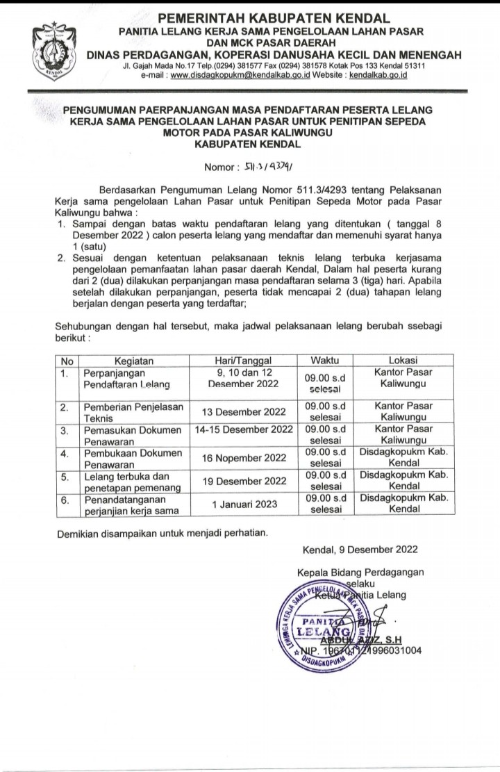 Kendal - Berdasarkan pengumuman lelang nomor 511.3/4293 tentang pelaksanaan kerja sama pengelolaan Lahan Pasar untuk Penitipan Sepeda Motor pada Pasar Kaliwungu, sampai dengan batas waktu ketentuan pendaftaran lelang pada 8 Desember 2022 calon peserta lelang yang mendaftar dan memenuhi syarat hanya 1 (satu).
